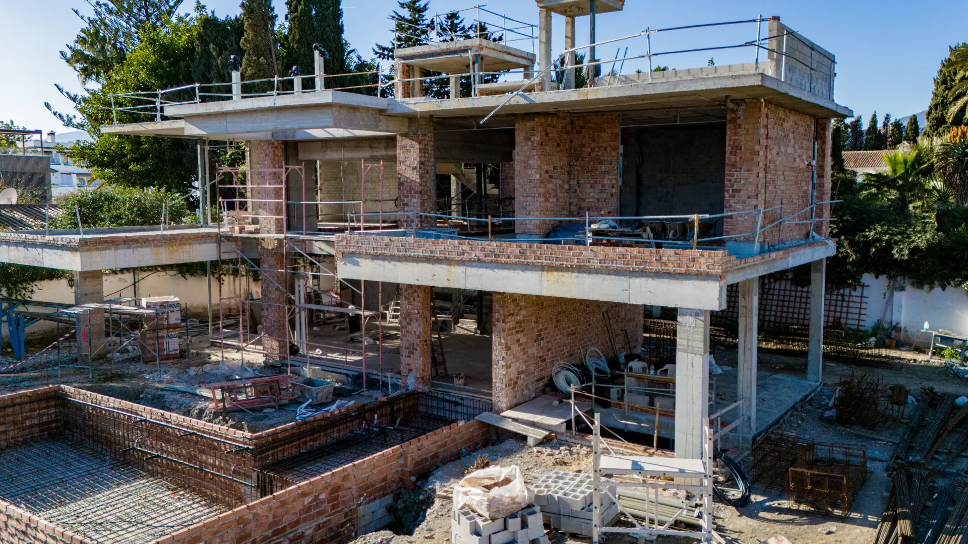 The outdoor garden area has a magnificent swimming pool of varying depths, designed for the enjoyment of the whole family. A flight of steps in the garden leads to the Pool Bar, where you can enjoy refreshing drinks by the pool. A pleasant waterfall cascading from the first floor terrace creates a curtain of water between the pool and the dining area, adding a relaxing touch of serenity to the garden. Upstairs is the sleeping area of the house, with a large master bedroom with its own dressing room and en-suite bathroom in one wing, offering maximum privacy. At the other end are two further en-suite bedrooms, providing comfort and space for the whole family. One floor above is the solarium, with its own swimming pool and barbecue area, ideal for romantic evenings under the moonlight and stars.