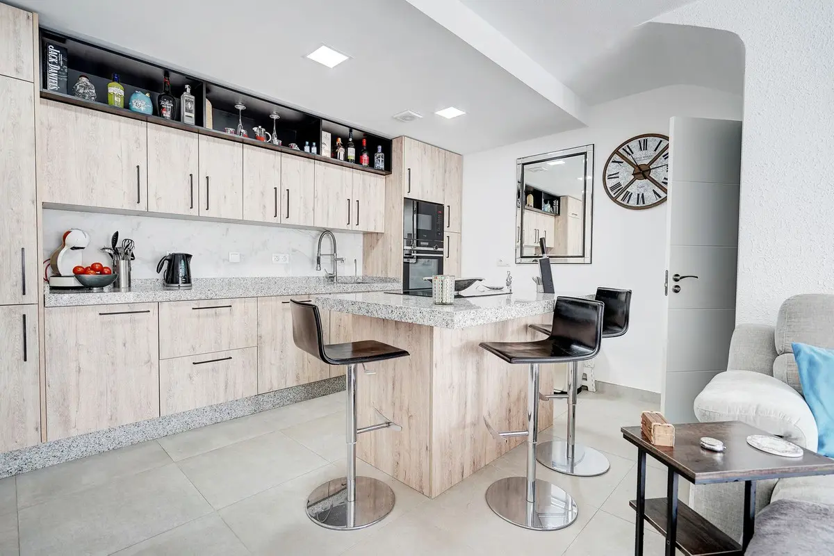 The main living level features a spacious lounge with an open-plan kitchen complete with a central island. This floor also includes a guest toilet and direct access to a private terrace with sea views. Upstairs, there are two double bedrooms and a full bathroom, along with access to a large upper terrace designed for outdoor living, offering both sea and golf views, barbecue area and a bioclimatic pergola for flexible shade and sun.